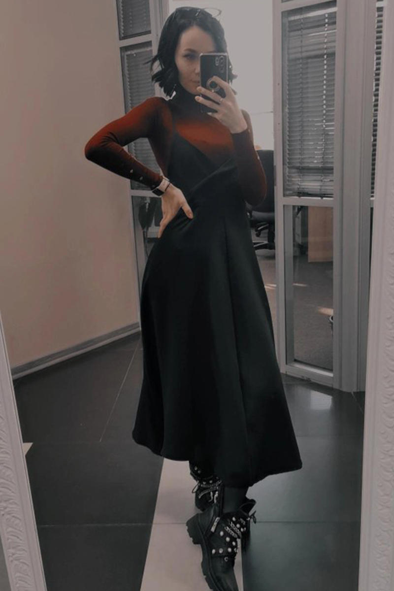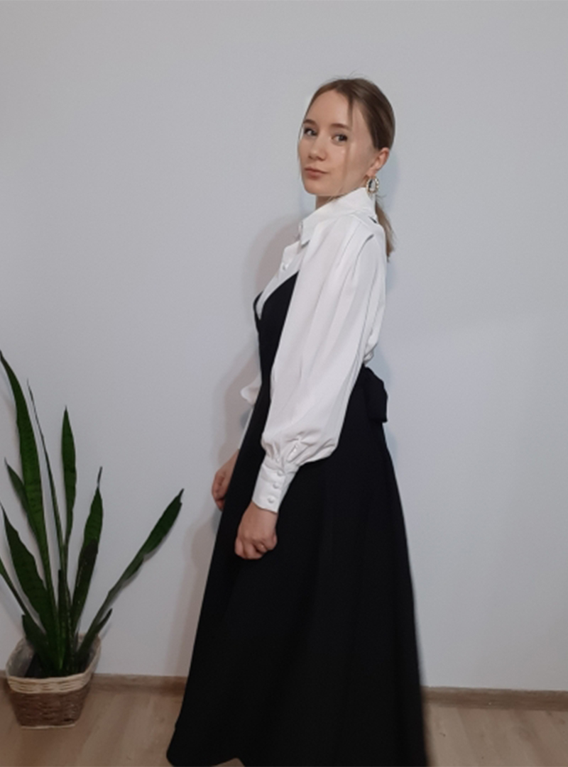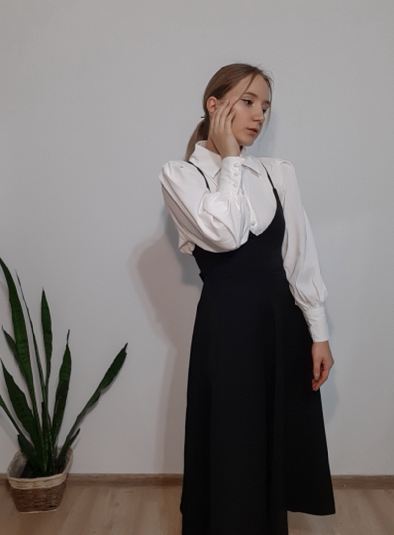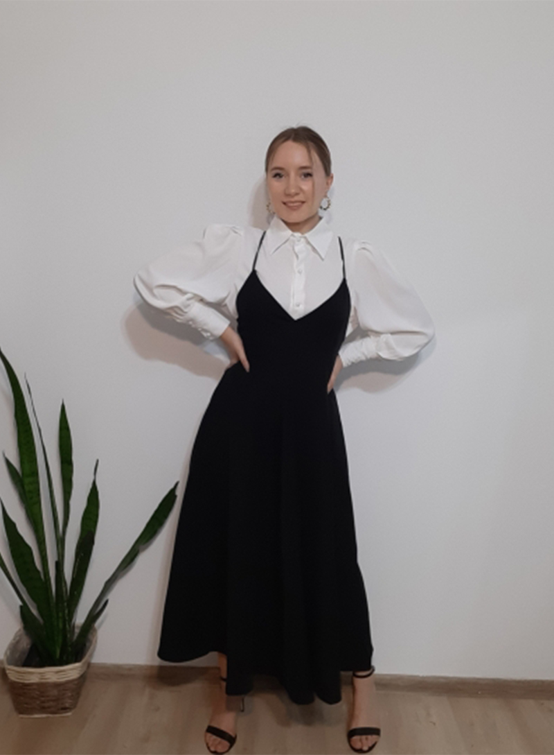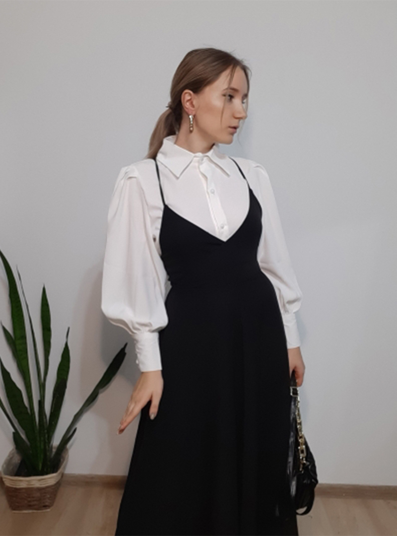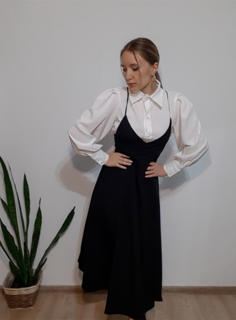 Взяла комплектом: платье и блузку. Платье шикарное. Прям воланами, ткань хорошая. Но блузка так себе. Во-первых, ткань – синтетика, сшито не очень хорошо, все на соплях. Ну это самое главное, что качество ткани плохое. А так мне просто с широкими плечами эта блузка не очень подходит к этому платью.