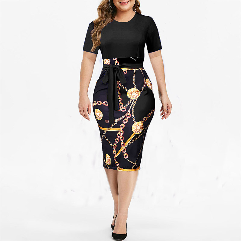 Vintage Print Plus Size Knee-length Dress Womens Summer Short Sleeve Midi Elegant Dresses Summer Sexy High Waist Robe 2021